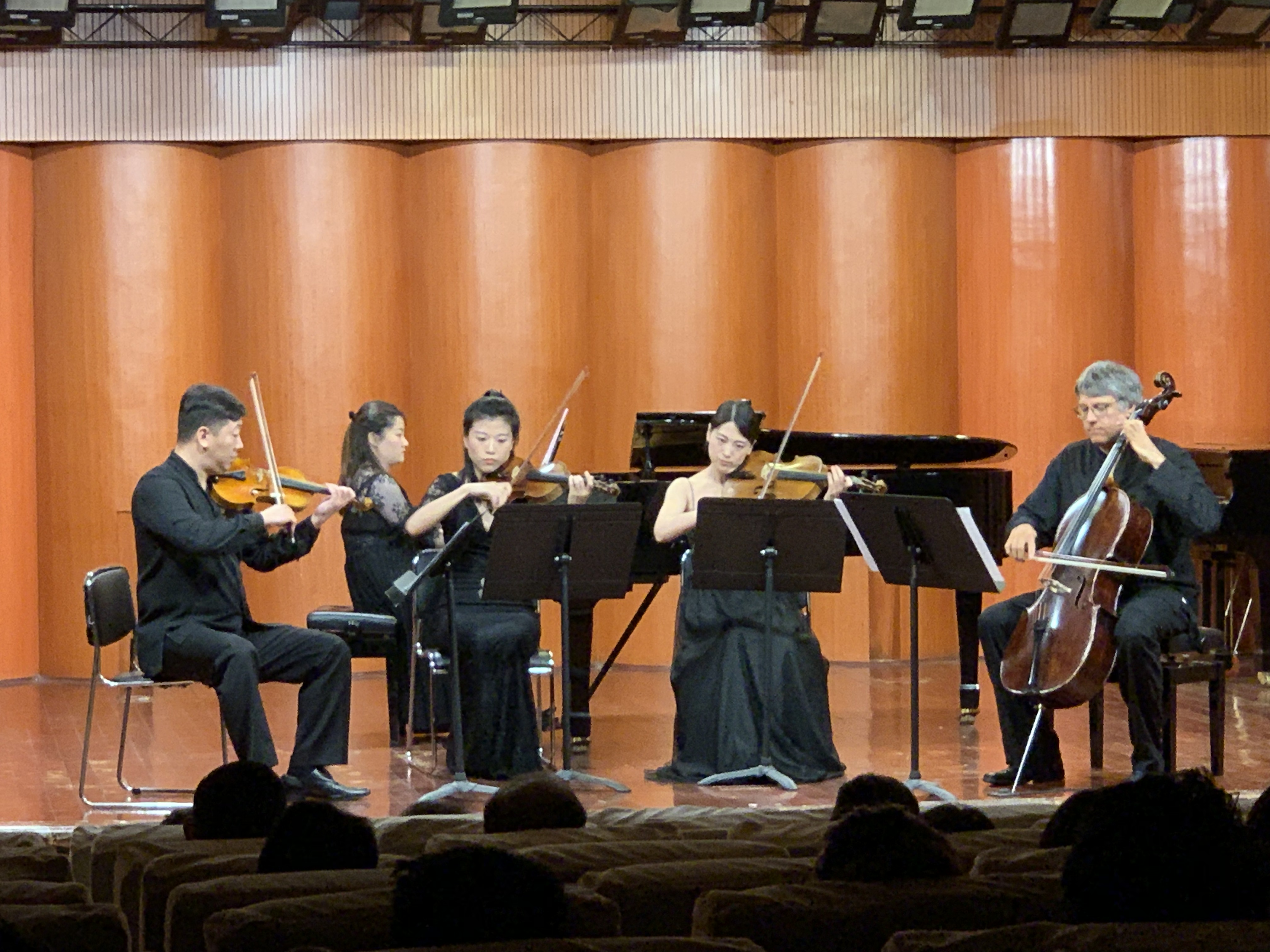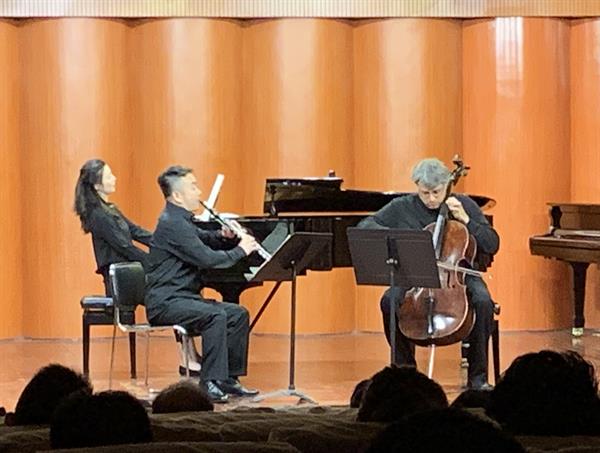 23日晚,管弦系教师在四川音乐学院聂尔音乐厅举办了室内乐经典作品专场音乐会。音乐会由管弦系主任、单簧管教授董德君, 外籍大提琴教授Alexander Suleiman和管弦系钢琴艺术指导教师仇潇潇演奏格林卡的《钢琴三重奏》开场。随后,小提琴教师石帅、中提琴教师刘瓅元演奏了约翰・哈尔沃森的中、小提琴二重奏《帕萨卡利亚舞曲》;管弦系青年教师李佳胤、付珍珍、吉祥、单小明、杨光演奏莫扎特为木管五重奏谱写的《降B大调嬉游曲》。最后,音乐会在Alexander Suleiman与青年教师温慧明、钟易非、刘瓅元、高袅演奏的舒曼《钢琴五重奏》中圆满结束。音乐会展示了管弦系教师的专业功底与合作实力,每曲奏毕,听众均报以雷鸣般的掌声,久久不息。