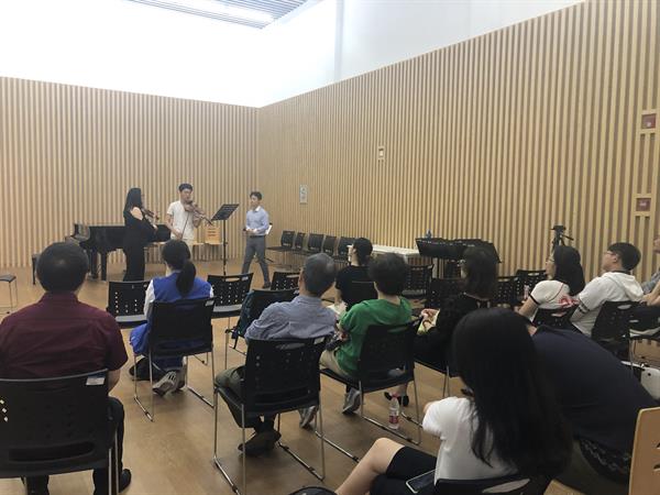 Amy老师在课上认真指导我院管弦系学生演奏了莫扎特的《D大调第四小提琴协奏曲》《A大调第五小提琴协奏曲》以及巴赫的《siciliana》。针对莫扎特的作品,Amy老师着重强调了乐句的连贯性,她认为莫扎特的音乐处理较为细致,需要有一定的弓段控制技巧、完整的句子表达能力、以及歌唱般的音色,还要保证每位观众能听清乐句的细节处理等。在巴赫的《siciliana》讲解中,她认为演奏巴赫的作品需要更多对琴弓的控制,追求柔美的声音和流畅的旋律线条,并提倡探索独特的演奏方法,强调可以在演奏中加入一些现代技巧。