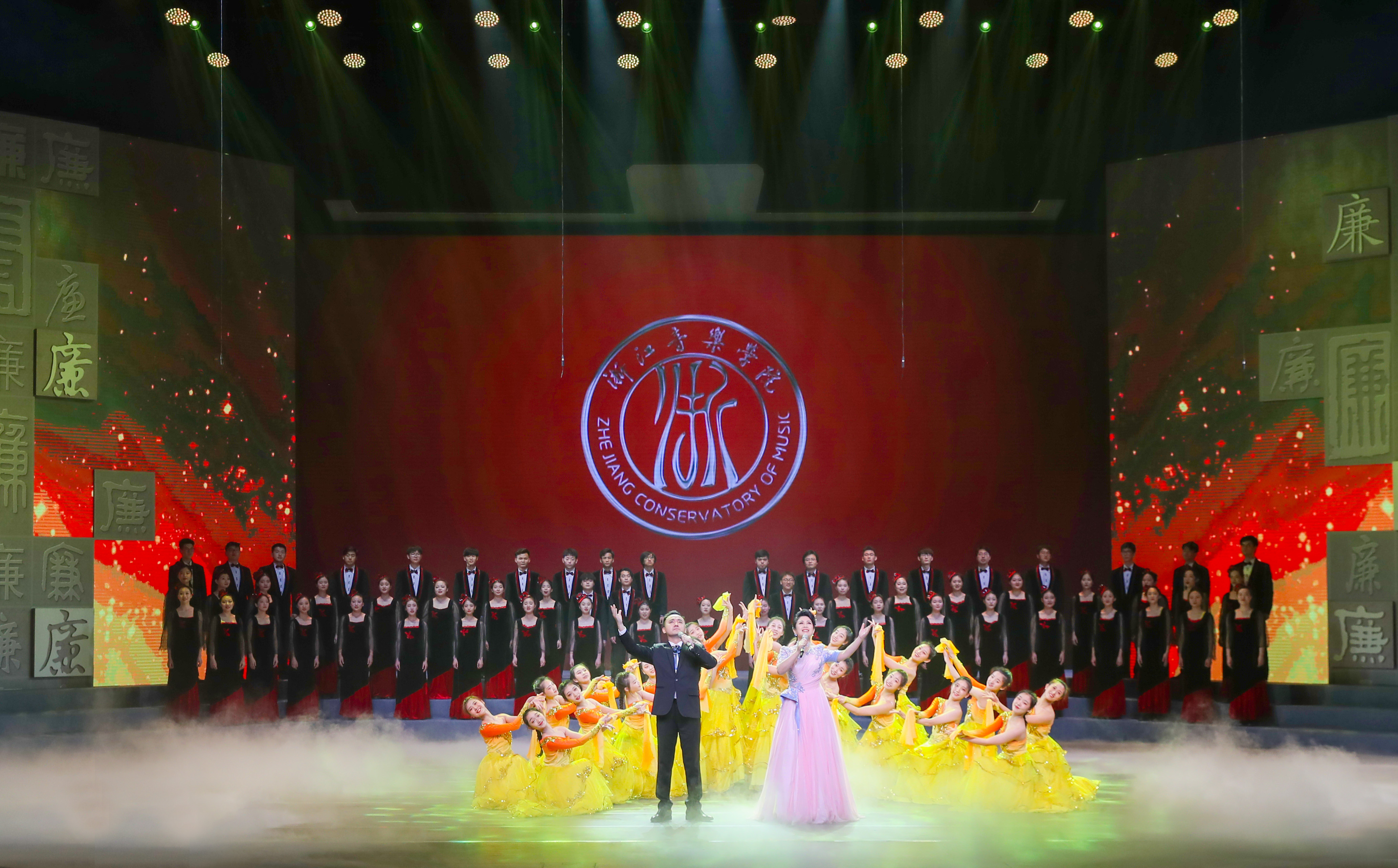 整场演出集中展现了学院一年来在清廉浙音建设,特别是廉洁文化方向创作表演的主要成果,和浙音人努力实施政治清明、制度清源、干部清正、校园清风、文化清流“五大工程”,实现干部廉洁从政、教师廉洁从教、职工廉洁从业、学生廉洁修身的使命担当。