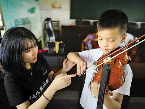 来自浙江音乐学院的12位大学生,将在这里和孩子们快乐地相伴一周的时间,为孩子们传递音乐入门知识,引导孩子们在7天内通过集中训练,提升如小提琴、大提琴、黑管、打击乐等的演奏水平。