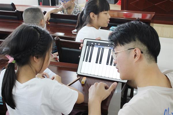 开营之初,“老师,五线谱上面这些音符为什么有高有低?”“老师,什么是高音谱号?”“老师,钢琴黑白键有什么区别?”“老师,我想知道音乐是不是可以带来快乐……”一连串的发问,一双双渴望的眼神,一群懵懂的孩子迫不及待地想和小老师们一同走进音乐的世界。