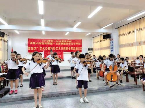 这个场景发生在一年一度的“安利美育学堂”暨“爱加艺”艺术公益项目暑期艺术夏令营的闭营仪式上。闭营仪式上,孩子们演奏了《茉莉花》等曲目,而浙江音乐学院的大学生志愿者们则给孩子们表演了《我和我的祖国》。