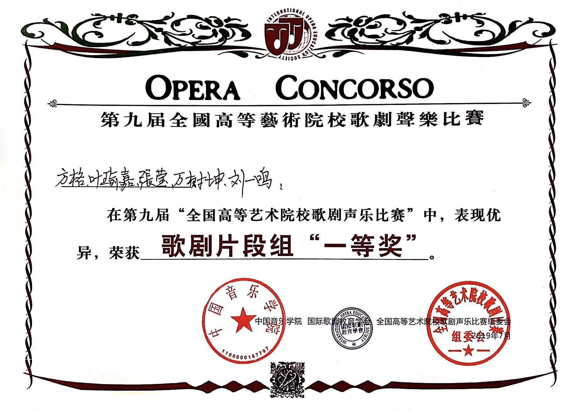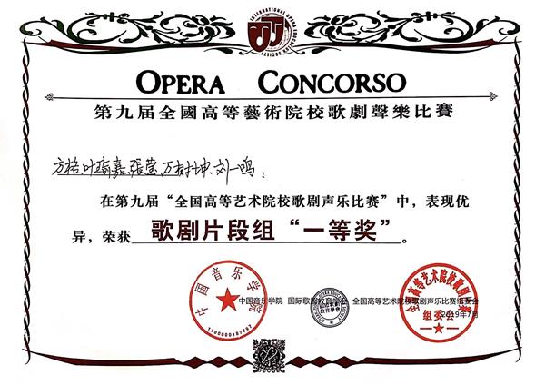现场,近千名展演选手从世界各地汇聚在青岛,共同参与此次声乐展演的盛况。我院学生充分展现优秀的专业素养,在展演中发挥出色,取得优异成绩。在歌剧重唱片段组决赛中,方格、叶瑜嘉、张莹、万树坤、刘一鸣演唱的五重唱《我们有一个大事件》选自歌剧《卡门》片段获得一等奖;梁齐蓉、康康国玉、李想、杜柏林、金振宇演唱的五重唱《我们有一个大事件》选自歌剧《卡门》片段获得二等奖;梁齐蓉、金振宇、王美玲、杜柏林、李洋、高艺芳演唱的民族歌剧《雷雨》片段,金振宇、王美玲演唱的二重唱《四凤,我的小羊》选自歌剧《雷雨》,熊同天、薛昊明演唱的二重唱《一会儿,我们悄悄去花园》选自歌剧《唐帕斯夸勒》获得三等奖。在歌剧咏叹调专业院校本科生组决赛中,康康国玉、王博获独唱类二等奖,熊同天获得三等奖,贾梦颖、王馨获得优秀奖。在中国作品专业院校本科生组决赛中,雕珊婷、覃苑旻、刘鸿枭、周先扬获得优秀奖。在外国艺术歌曲专业院校本科生组决赛中,薛昊明获得优秀奖。在外国艺术歌曲综合院校本科生组决赛中,楼业达获得优秀奖。学院声乐歌剧系教师陶维龙、胡雁、张蓉、刘伟获得“优秀指导教师奖”,学院声乐歌剧系教师金麦克荣获“优秀艺术指导奖”,声乐歌剧系获得最佳组织奖。
