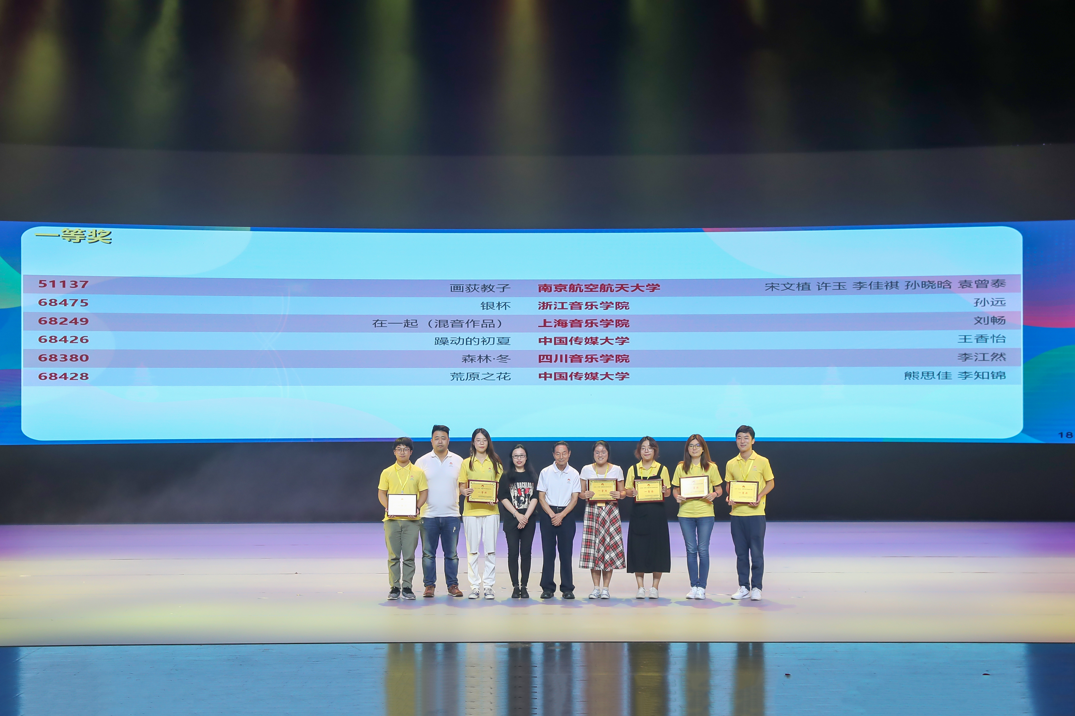 经过两天的激烈角逐,此次大赛共产生一等奖40件,二等奖161件,三等奖308件,决赛入围奖53件。比赛期间,浙江音乐学院参赛学生积极备赛,最终参赛的8件作品全部获奖,其中一等奖1项,二等奖6项,三等奖1项。在计算机音乐类的比赛中, 18级音乐设计与制作专业学生孙远的作品《银杯》获编曲组一等奖。17级音乐设计与制作专业学生侯九亨的作品《淹没》与18级音乐设计与制作专业学生付若凡的作品《女巫森林》获原创歌曲组二等奖。18级音乐设计与制作专业学生袁石的作品《Fear less》获原创音乐组二等奖。16级音乐设计与制作专业学生关嘉源的作品《在一起》获混音组二等奖。18级音乐设计与制作专业学生周楚桢《Journey in the Dream》获视频音乐组三等奖。在数媒微电影类的比赛中,18级音乐设计与制作专业学生袁石与18级艺术与科技专业学生孙旖璐、李梦甜、王加勉跨专业合作的影片《牡丹遗梦》获微电影组二等奖。17级音乐设计与制作专业学生全佳琪、侯九亨、黄佩莹、黄倩雯、孔悦耳的影片《踏古埙音》获纪录片组二等奖。