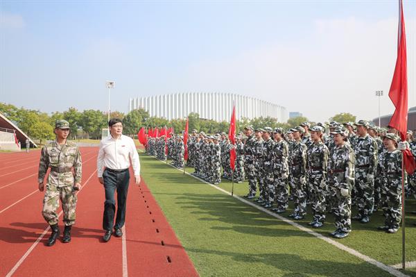 胡建新在吴龙的陪同下对2019级600余名新生进行检阅。