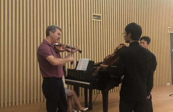 在大师班上,彼得教授指导学生们演奏了德沃夏克的《A大调钢琴五重奏》Op.81(Dvorak piano quintet Op.81 1mov),此曲是德沃夏克表现民族风格与精神最贴切的作品之一。他指出,学生在演奏中,要始终如一地充满了对音乐的情感表达,不应随意间断。他强调,乐器是为音乐的表达而服务的,无论什么乐器都不要拘泥于技巧,而是在放松的状态下进行的。关于技法方面,彼得教授表示要根据音乐风格考究地运弓,以塑造不同的音乐形象。