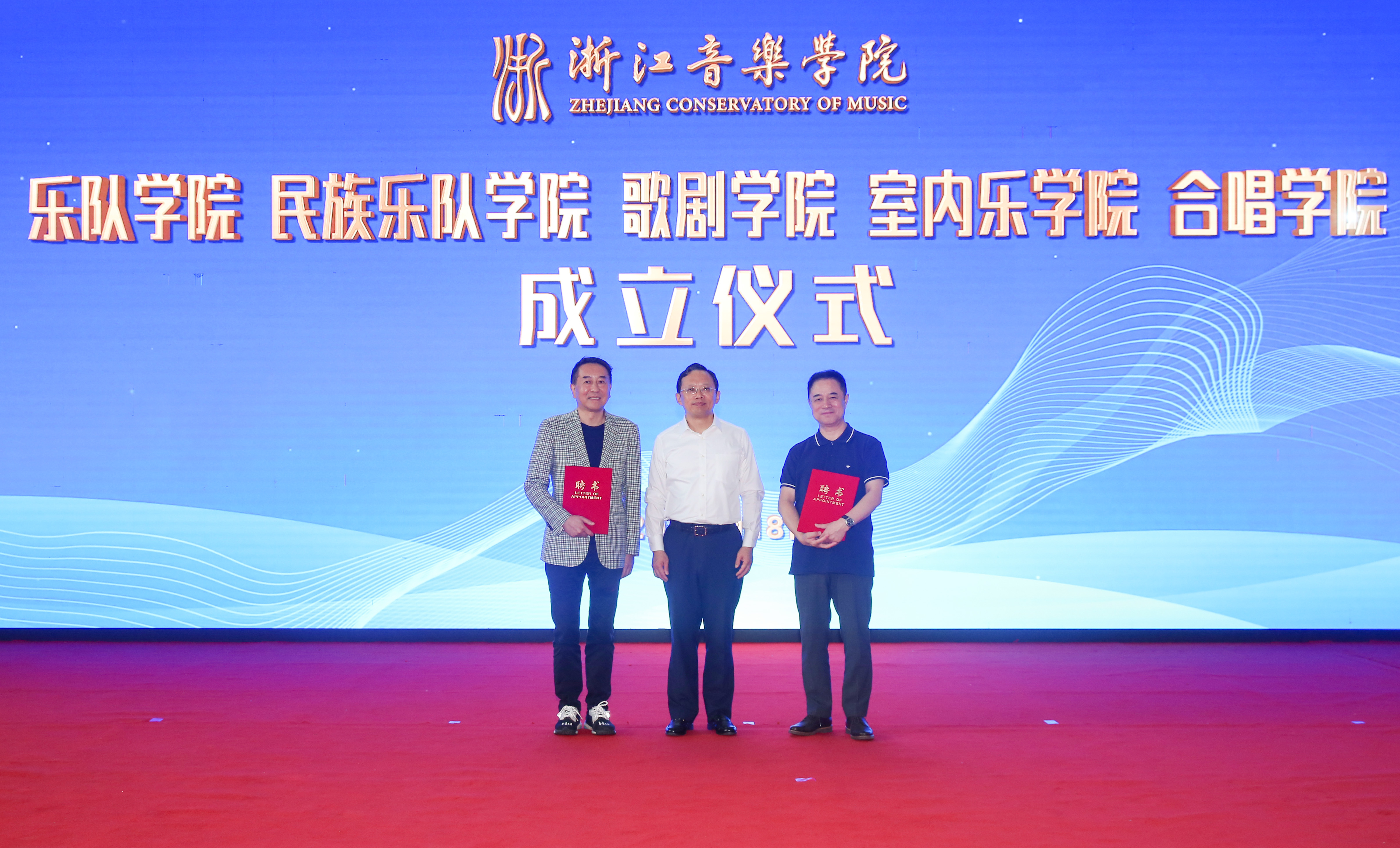 郭义江教授代表浙江交响乐团致辞。乐队学院艺术总监胡咏言教授、民族乐队学院艺术总监王甫建教授现场接受聘任并发表感言,室内乐学院艺术总监宁峰、歌剧学院艺术总监栾峰教授、合唱学院艺术总监詹姆斯·乔丹(James Jordan)教授通过VCR送上祝福。
