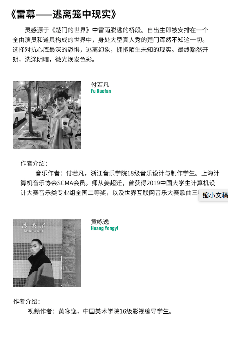 首页 > 浙音新闻网 > 通知公告 第二届之江国际青年艺术周浙音展区 来源:宣传部 作者:宣传部 时间:2020-06-29 人气: 2020年之江国际青年艺术周 浙江音乐学院线下展区 展出时间:2020年6月28日—7月4日地 点:艺创小镇•象山艺术公社 指导单位:中共浙江省委宣传部 / 杭州市人民政府 主办单位:浙江省文学艺术界联合会 / 中共杭州市委宣传部 中国美术学院 / 浙江音乐学院 / 西湖区人民政府 承办单位:西湖艺创小镇 协办单位:未来事务管理局 观展方式:浙音学生可凭一卡通进入 返回 打印 下一篇: